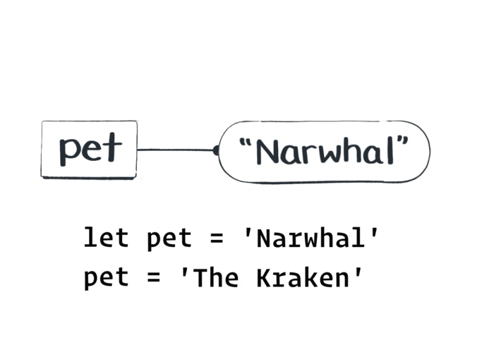 Další představou může být, že proměnná je drát spojující jméno a hodnotu. Na straně jména je připoután pevně. Podle druhu proměnné může být k hodnotě připoután pevně nebo slabě - tedy může se snadno změnit. Myšlenka drátů pochází od Dana Abramova - jednoho z vývojářů ve Facebooku. Zaměřuje se na správné přemýšlení o kódu - hodně nás ovlivnil jeho kurz Just Javascript. Na gifu níže se drát, který propojuje proměnou pet (mazlíček) změní, jakmile proměnné přiřadíme novou hodnotu.